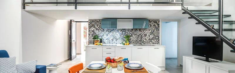 Loft In Sorrento befindet sich in Sorrento. Der Eingang führt über einen kleinen Korridor, der zu einem modernen und geräumigen Wohnzimmer, Esszimmer und einer Küche führt, die mit hellen Blau- und Weißtönen und mediterranen Fliesen kombiniert sind. Dieser Raum profitiert von einem Zweisitzer-Sofa (mit Doppelschlafsofa-Option), einem ausziehbaren Esstisch für 6 Personen und einem Flachbildfernseher. Die Küchenzeile bietet allen modernen Komfort für die Zubereitung von Mahlzeiten und umfasst alle wichtigen Dinge wie Induktionskochfeld, Geschirrspüler, Backofen, Kühl- und Gefrierschrank, Wasserkocher, Toaster und Moka-Kaffeemaschine. Es gibt auch eine Waschmaschine, Bügeleisen und Bügelbrett zur Verfügung.