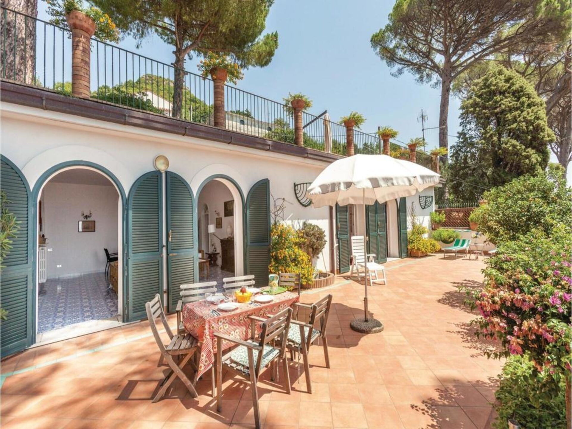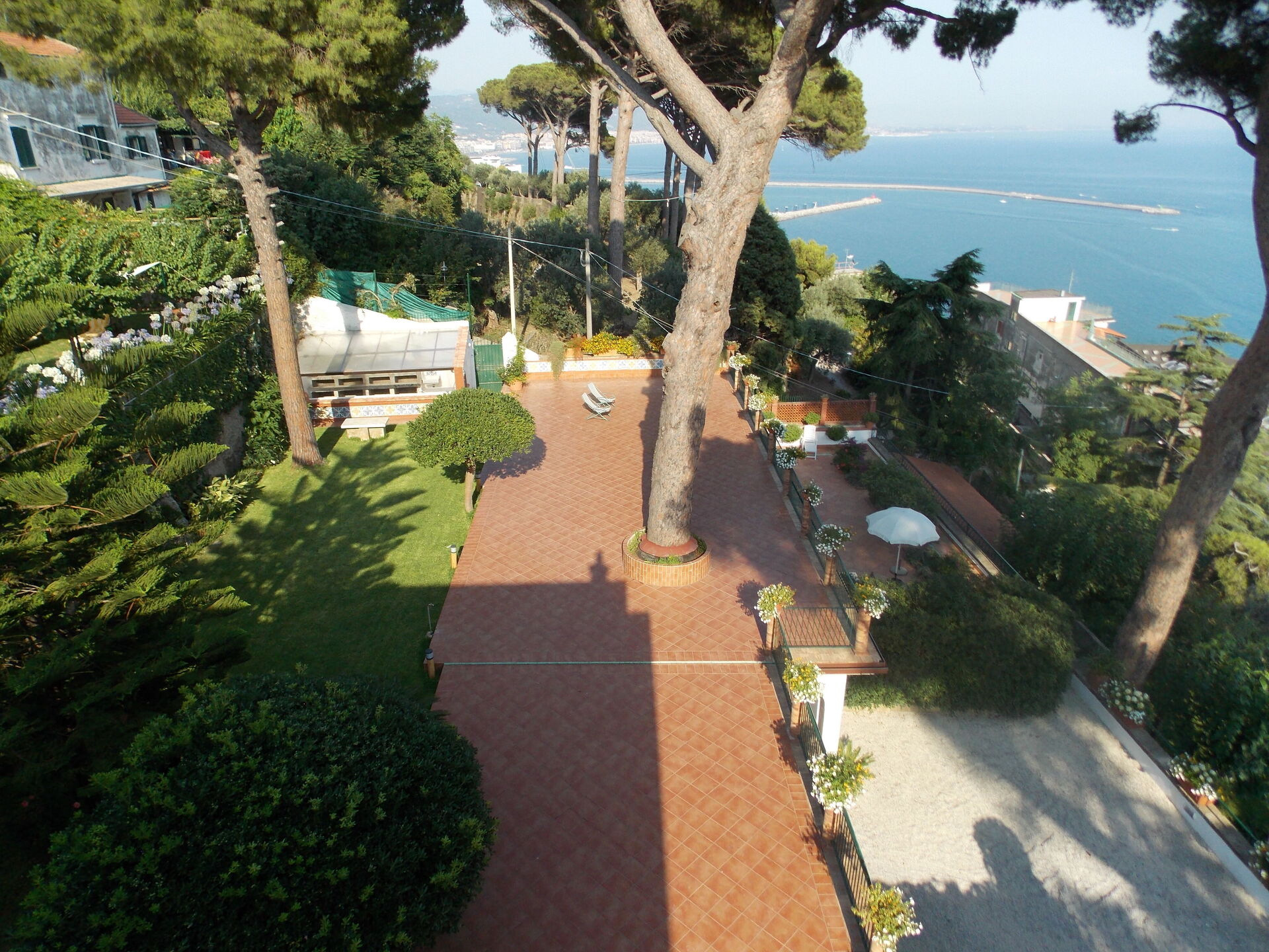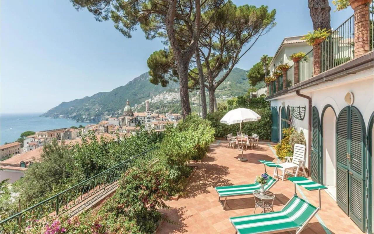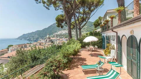 Im Erdgeschoß: Eingang, Wohnbereich/Essbereich, ausgestattet mit SAT-TV, 2 Sofas, eine Küche mit vier Kochfeldern, Ofen, Kühlschrank mit Gefrierfach, Geschirrspüler und Waschmaschine; 1 Doppelbettzimmer; 1 Schlafzimmer mit zwei Einzelbetten; 1 Badezimmer mit Dusche (WC/Bidet); 1 Badezimmer mit Badewanne (WC/Bidet); große private Terrasse mit circa 120qm sowie wunderschöne Aussicht auf das Meer und den Ort Vietri sul Mare. Einfache und komfortable Einrichtung.