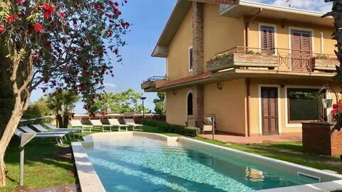 Alla Villa si accede attraverso un ampio e curatissimo giardino attiguo al terrazzo arredato con tavolo, sedie ed ombrellone.
