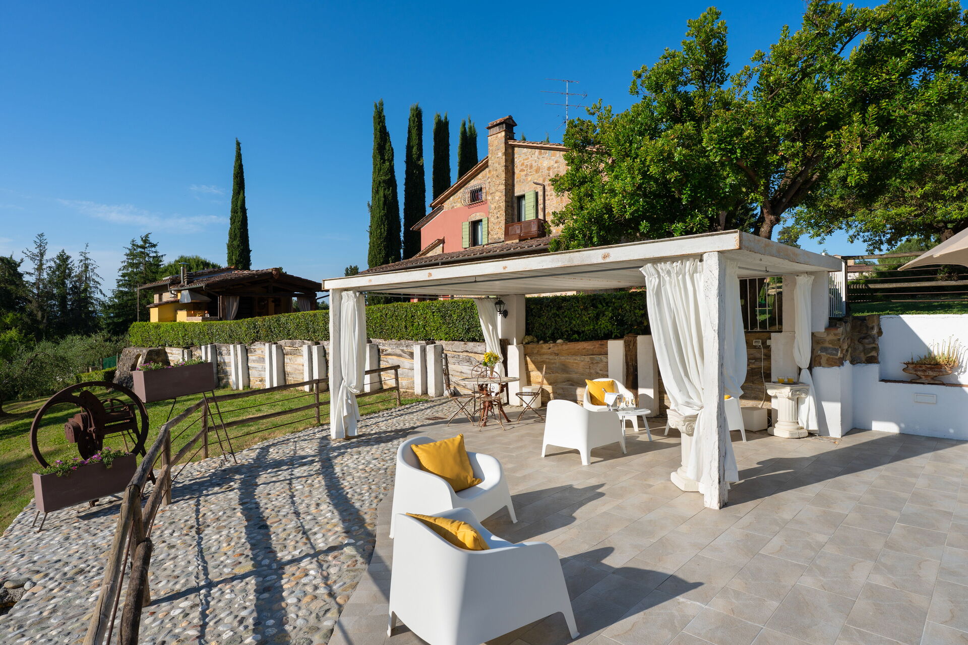 Per rinfrescarti nelle calde giornate estive tuffati nella piscina baciata dal sole tutto il giorno, comprensiva di lettini, un porticato ed arredo da giardino, ben 2 ettari di ampio verde. Al tramonto, dopo un giorno trascorso ad esplorare le più belle città d’arte della Toscana come Siena, Pisa e Firenze, con i loro musei e negozi o il vicino borgo medievale di Gambassi Terme, fermati per un romantico aperitivo a bordo piscina degustando il buon vino delle cantine circostanti.