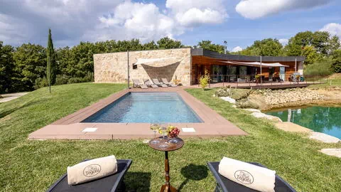 Il giardino che incornicia la villa si estende per circa 4000 mq, è molto ben curato, per la sua gran parte a prato, ospita alte piante di ginestra che fanno da padrone circondando il laghetto naturale di fronte alla zona pranzo esterna e alla piscina. Il laghetto, la cui profondità al centro raggiunge i 2,5 m, non é balneabile. L'atmosfera è silenziosa, rilassante e riservata. La zona pranzo esterna è riparata da ampie vele che coprono tutta l’area dove sono presenti il tavolo, le sedie ed un barbecue professionale, perfetta per pranzi e cene all'aperto. Personalizza la villa 10 ettari di terreno per la gran parte disponibili per le lunghe cavalcate nella bellissima cornice toscana, un luogo destinato al ristoro del corpo e dello spirito.