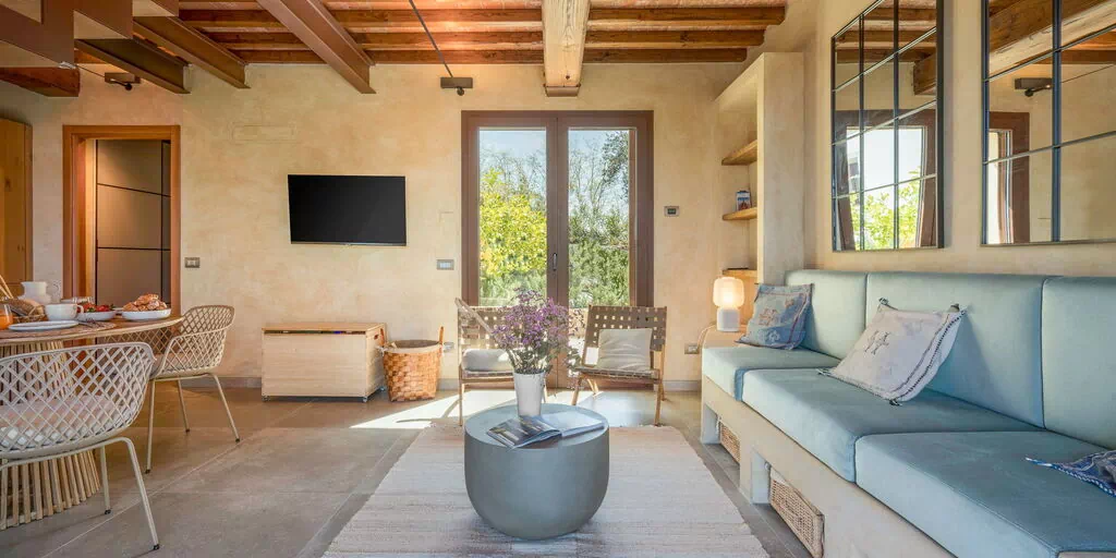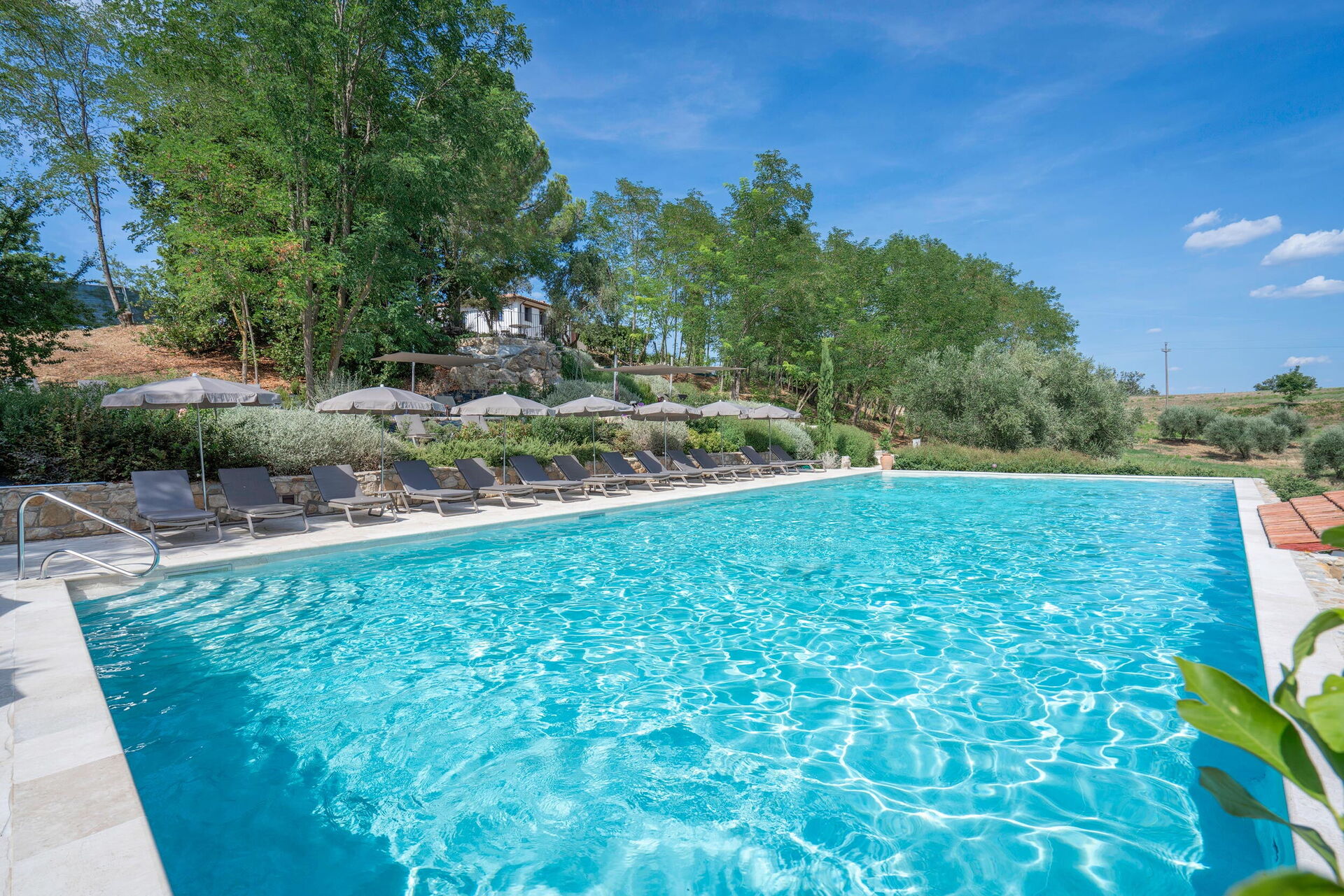 Spereto Punteriolo in Montaione is part of a farmhouse with a private outdoor area. The outdoor swimming pool in a panoramic position is heated. The Spereto property is located in a strategic position with a beautiful view of the countryside and the historic village of Montaione. Each outdoor area is private and maintained with great attention to detail. The communal swimming pool is surrounded by a well-kept sun terrace with garden furniture and a parasol for each unit. Toilets, outdoor shower and outdoor kitchen complete the pool area. Uncovered parking spaces within the property. Cars are not allowed at Borgo di Spereto.