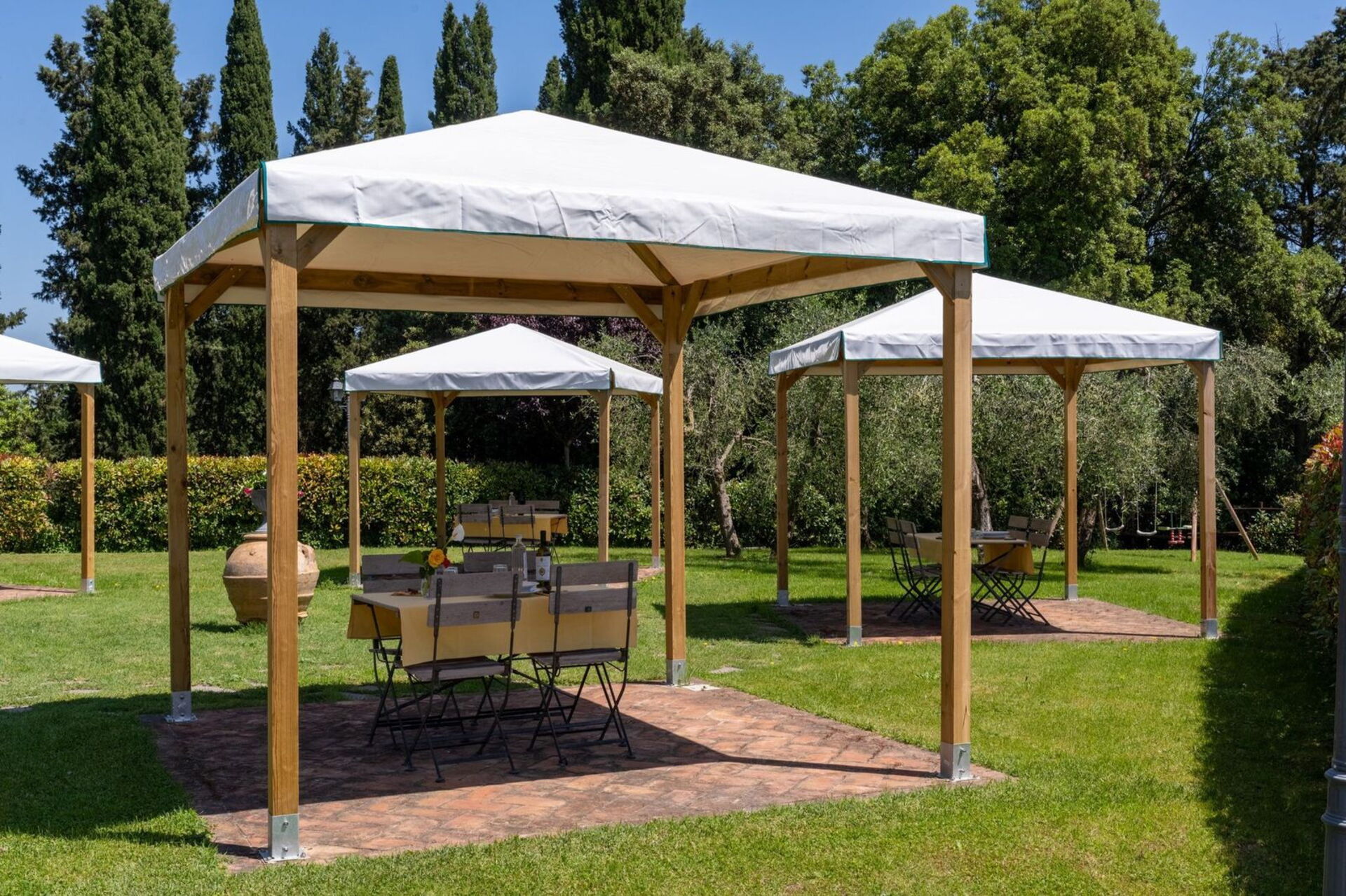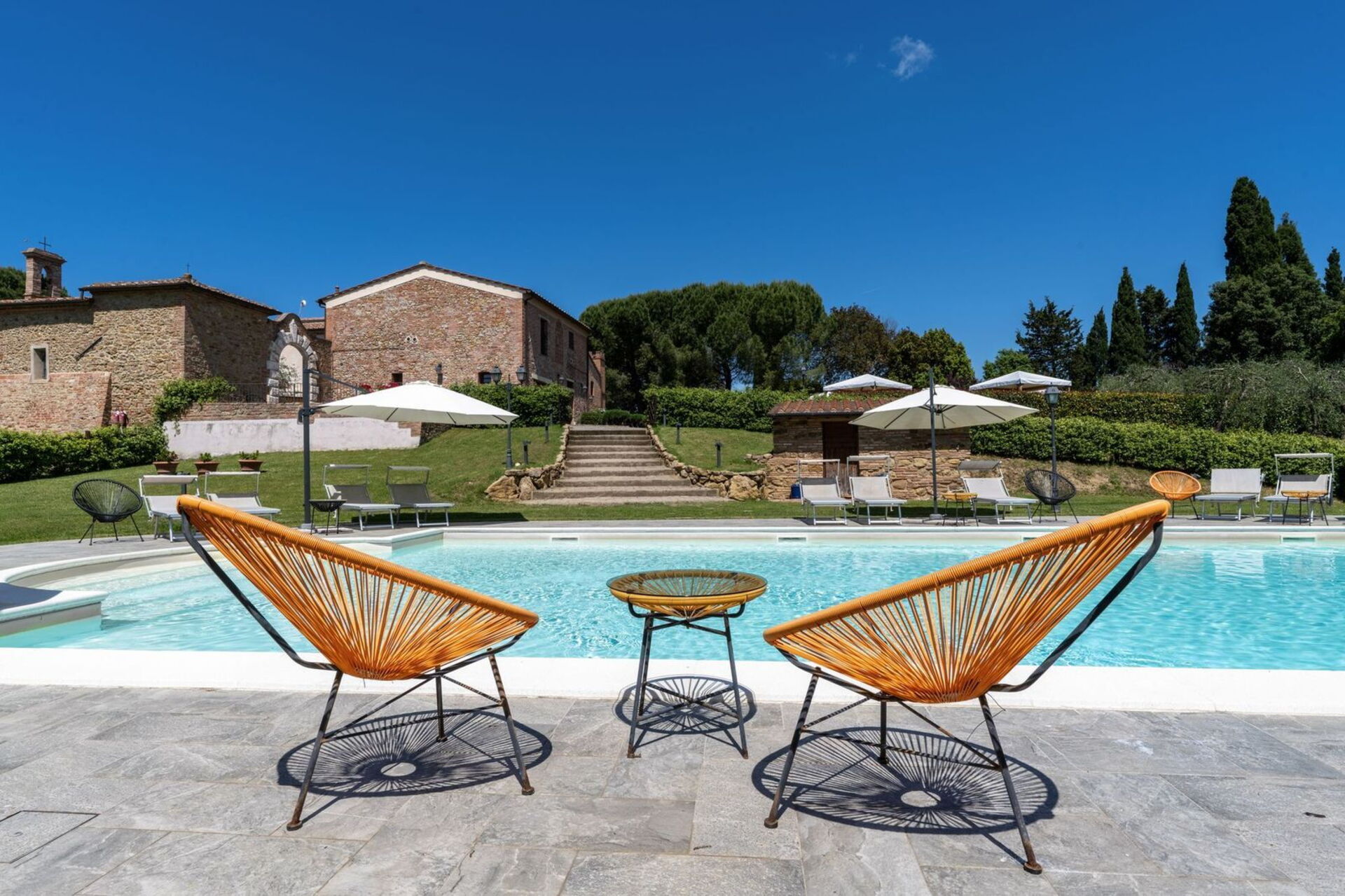 Guests can enjoy well-maintained outdoor spaces, including a private outdoor swimming pool, a relaxation area with a private gazebo for each apartment, a barbecue area, and a shared veranda ideal for convivial moments. Within the property there is also a consecrated chapel, an exclusive venue for weddings and private events.