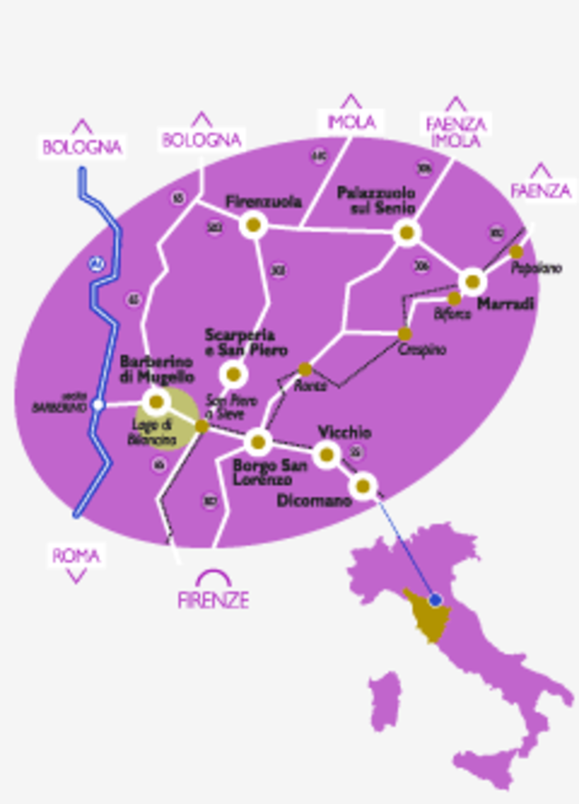 A few kilometres from Florence, among the rolling hills, the tall cypress trees, and against the background of mountain peaks and passes, stretches the territory of the Mugello. Silent waters, a delightful countryside friendly, peaceful and hard-working people, healthy food, the places of the Medici, the historical villas, all to be found just outside Florence. History, culture, high quality service in a renewed relation with nature these are the things the Mugello has to offer. Access by bus and by car to the various localities in the area is excellent. From the A1 motorway, there is the exit at Barberino di Mugello. There are several interesting secondary roads too. The fascinating old "Faentina" railway line takes the visitors into the Mugello area from the Romagna region departing from Faenza or from Tuscany departing from Florence. Local public transport is available for travelling in the localities.